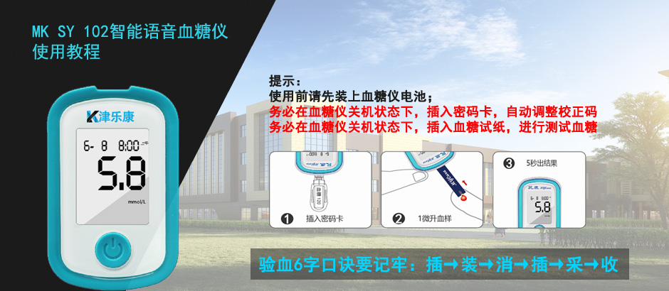 民康MK SY102智能語音血糖儀使用教程,提示: 使用前請先裝上血糖儀電池; 務必在血糖儀關機狀態(tài)下,插入密碼卡,自動調整校正碼 務必在血糖儀關機狀態(tài)下,插入血糖試紙,進行測試血糖